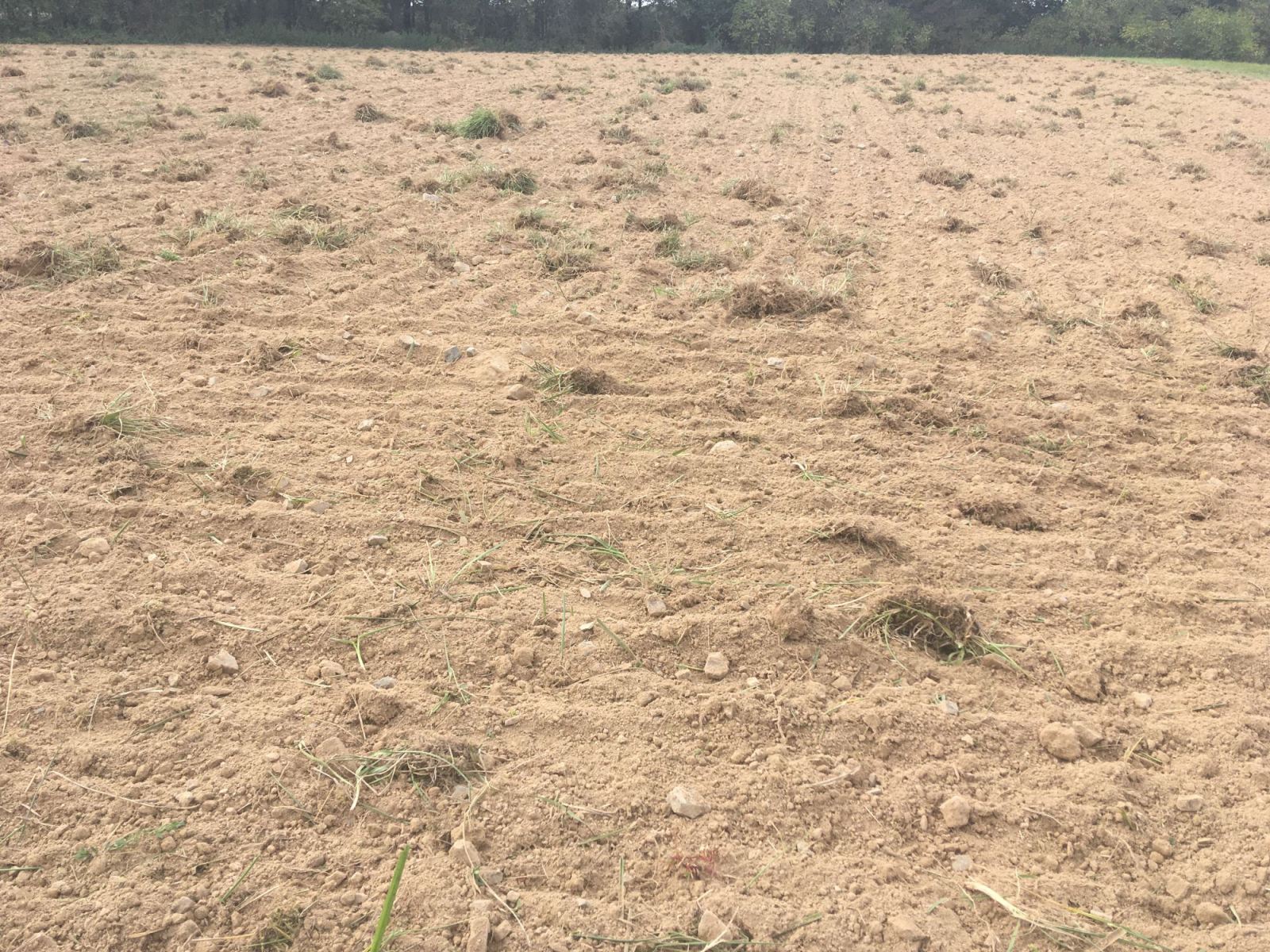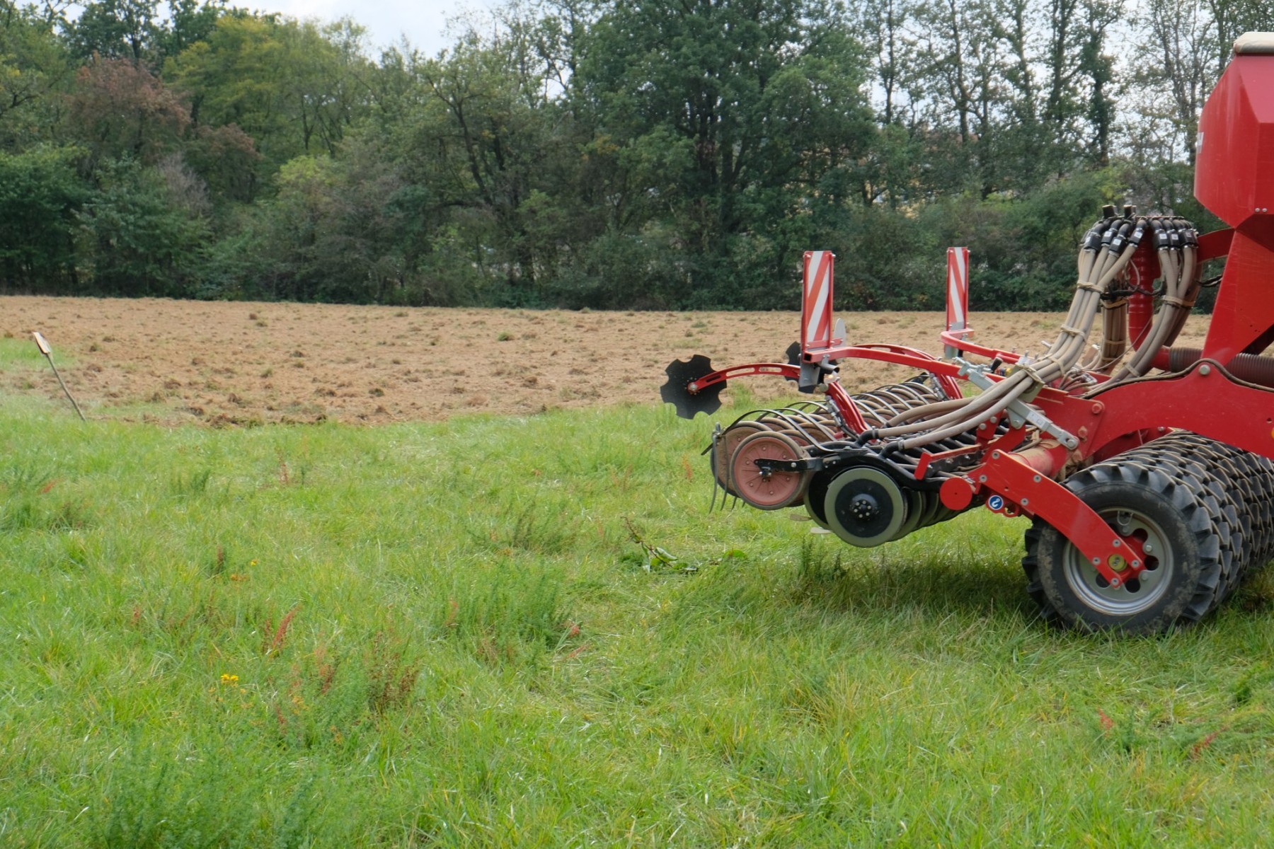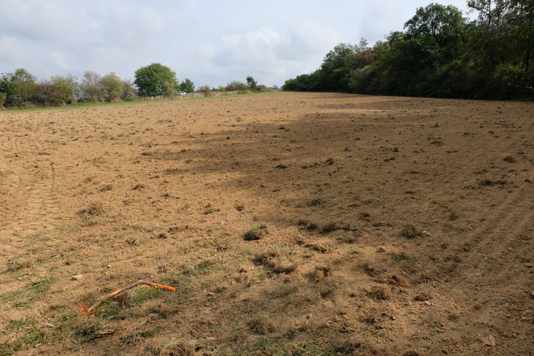 Pro louku jsem vyčlenil kolem 3 000 m² v horní části pole. Po konzultaci s místní zemědělkyní jsem vybral osivo pro mezofitní květnaté louky (luční květiny 80%, traviny 20%) a využil služeb jejich techniky. Jejich traktor zvládl orbu, přípravu pro setí a samotné setí snadno v jednom dni. Bylo to v jeden zachmuřený den na začátku podzimu. Pár dní nato začalo pršet a další dny se oteplilo. Některá semena a zvláště pak rychlé traviny již klíčí a rostou. Příležitost vyklíčit v odhalené půdě dostala také semena jednoletých bylin, se kterými budu bojovat včasnou sečí zvláště v následujícím roce. Hlavně je nenechat vysemenit, jejich úkolem je udělat stín a zajistit ideální podmínky pro zaseté luční kvítí. To v prvním roce bude hlavně zakořeňovat a do květu vyrazí až dalším rokem.