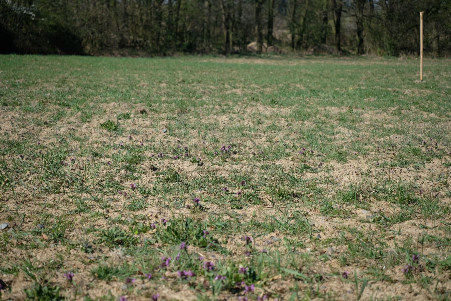 Porost vzchází velmi pomalu, nepravidelně a pokryv půdy je zatím velmi slabý. Způsobuje to velké a dlouhotrvající sucho. Na konci dubna konečně zapršelo a to stačilo, aby ohnice hodně poskočila a rozkvetla. Během několika dní se tak celá louka zabarvila do žluta. Tam, kde nepřevládla ohnice, si to vzaly na starost květem nenápadný huseníček rolní a kokoška pastuší tobolka. Sem tam se vyskytují další kvetoucí rostlinky hluchavka nachová, violka rolní a pomněnka chlumní.